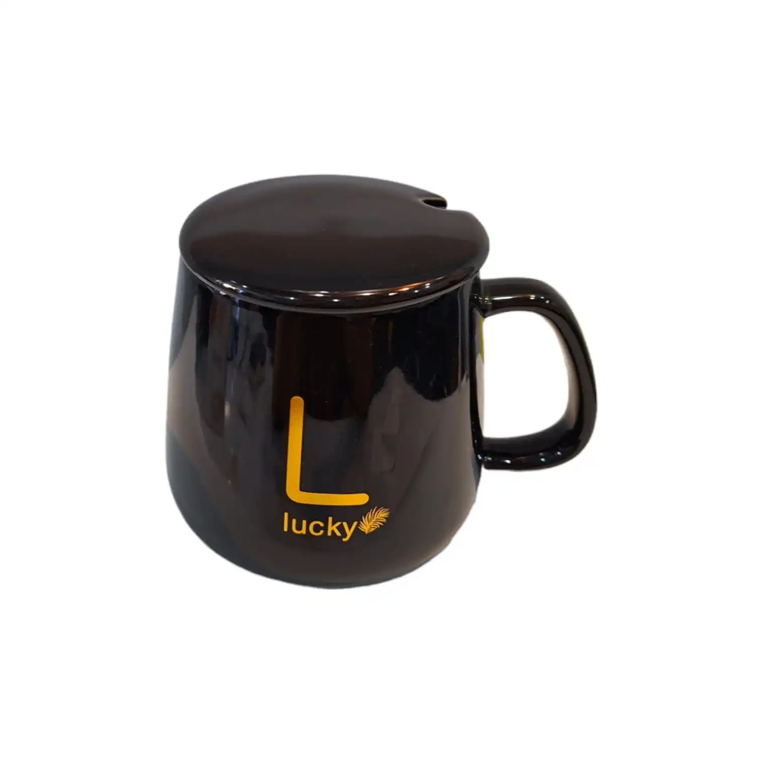 | طرح چاپی | نوشته "lucky" طلایی با برگ تزئینی و حرف "L" مشکی |